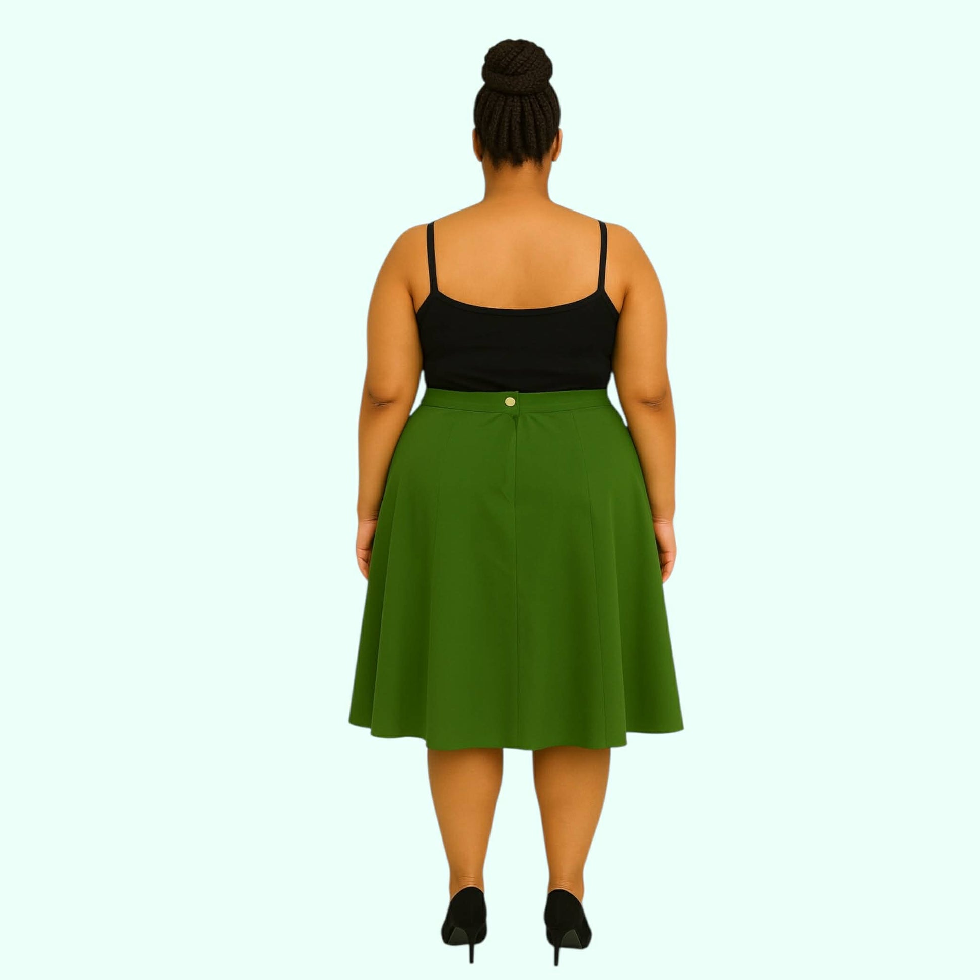This vibrant green calf-length skirt offers a clean, flattering silhouette with a smooth waistband and subtle flare. Featuring a back zipper with button closure, it combines comfort and style in one versatile piece. Pair it with a blouse, tee, or jacket for an easy transition from day to evening.