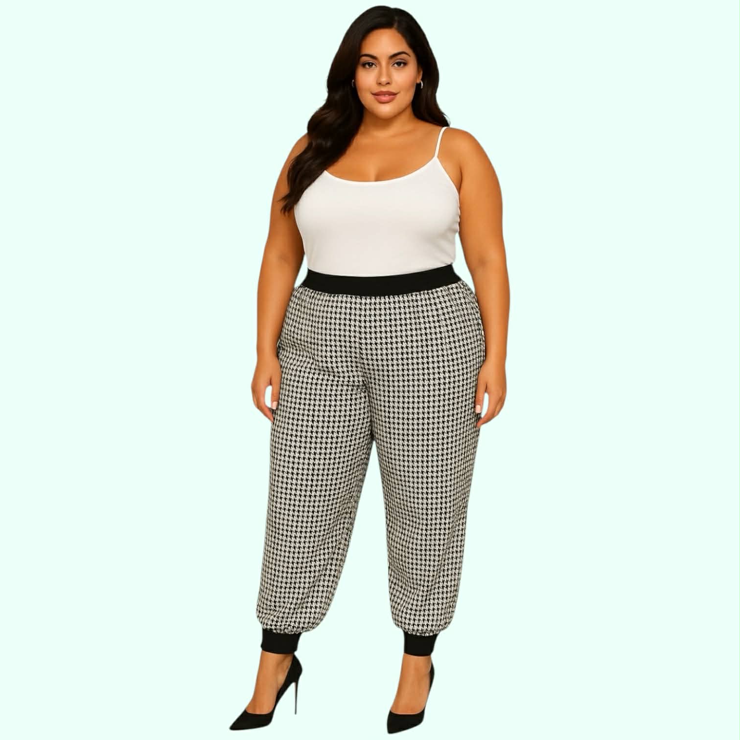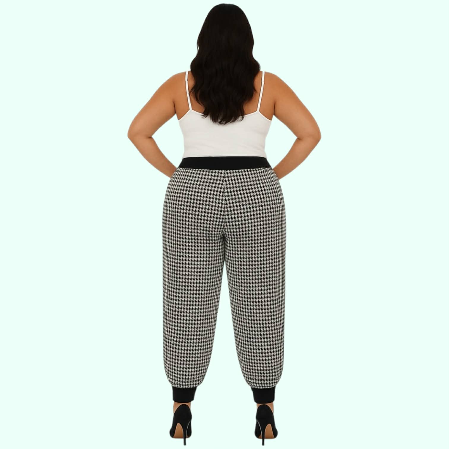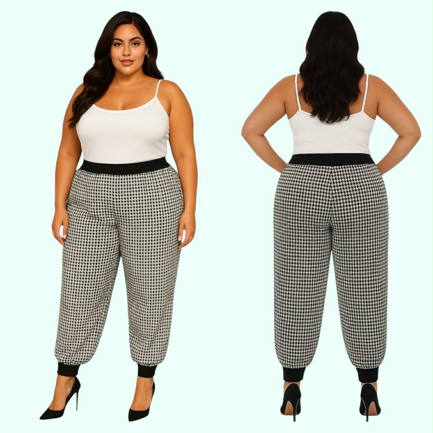 .This pair of pants features a French terry houndstooth fabric, known for its soft and slightly textured feel. The houndstooth pattern consists of a classic black-and-white geometric design, adding a timeless and sophisticated style.